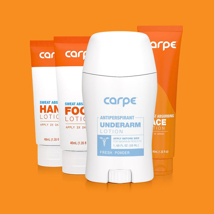 We worked with some of the most experienced skincare experts in the industry, dermatologists, and countless everyday folks who sweat – and the result is Carpe’s sweat absorbing products. Carpe's Face Lotion and Wipes are a unique mixture of sweat- and oil-absorbing molecules, which, when combined result in a dry look and feel.